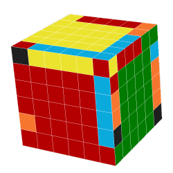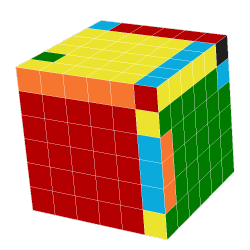 If you're having problems resolving the last two or three groups, look at our additional edges page for some more advanced techniques, algorithms, and ideas that may come in handy as you get more familiar with the solving process. Example continued As shown above, we will now be pairing up groups of edges pieces in our example. There are 12 groups of edges, each consisting of four pieces. We will match them up piece by piece until we have completed an entire group, and then store that group on the Up or Down face of the cube. Sometimes everything will work out, but more often than not there is extra work at the end of matching things up to complete all the edge groups. The description will walk you through the first couple builds, but gives less detail as it goes along. Anything not shown is for the reader to figure out as an exercise. Since you know what color group is being fixed, it should be easy for you to follow what's going on. Also, notice how the green/yellow and blue/red group are intentionally paired up with the outside edges swapped. Edges: Blue/Black: F2 U F u2 d R' U R u2 d' The F2 puts the blue/black piece in the bottom so we can do the U move to place another blue/black piece across from it. F puts both of these in the middle slice so all 4 pieces are set up in the middle layers. Notice how the rest of the alg is almost exactly the same forward as it is backwards. u2 d align the top and bottom blue/black piece with the pair of blue/blacks on the back face. R' U R pulls the fixed group out of the build layer and replaces it with an unfixed edge. u2 d' restores our centers back to the solve position, and now you should have a blue/black group in the back of the top face. Orange/Black: R U2 R' u' 3D2 R U' R' u 3D2 Here R U2 R' grabs the black oranges in the Up layer and brings them opposite of the black/orange on the FL border. u' and 3D2 match up the 4 pieces, then R U' R shoots the group up into the top layer. Finally, u and 3D2 restore our centers. Red/Black: F2 u' R U2 R'3D'L' U' L u 3D U'F D L' 3U' R U' R' 3U This one is a bit more cumbersome. We're forced to do just 3 pieces, then reset and position to get our final piece in. The rest of the edge groups are shown below: Red/Yellow: R2 u L' U L u' F'L 3D' L'U L 3D B d L U' L' d' Orange/Yellow: R U2 R' 3D' L' U' L F' L F L' 3D D R d' L' U L d Green/Black: R U' R' d 3d2 L' U' L d' 3d2 F' R 3D' L' U L 3D Blue/Yellow: x2 L U R U' R' d 3d R' U2 R d' 3d' Green/Yellow: R 3d2 L' U' L F' L F L' 3d2 (swapped wings) Blue/Red: y2 D2 R u 3D' F U' F' u' 3D (swapped wings) Blue/Orange: L2 3D2 R U2 R' 3D2 L R2 3D2 U' L' U L 3D2 Orange/Green: R2 u' R U R' F R' F' R u Fix 2 parity groups: U2 R' u' d R U R' F R' F' R u d' Take special notice that we have stored the Green/Yellow group in BR and it still has the wings swapped. Solution Step One: Solve Centers Edges Step One: Solve Edge Groups Edges Step Two: Special Edge Cases Solution Step Three: Solve as a 3x3 Solution Home: Solve the V-CUBE |